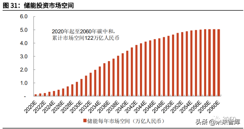 2020 年儲能成本約 1.2 元/Wh,根據(jù)儲能成本學習曲線,降本約 60%,至 2060 年年均成本降幅為 1.75%,測算得出 2025 年儲能投資市場空間 0.45 萬億元 (2020 年起累計 1.6 萬億元,下同),2030 年 1.3 萬億元(累計 6 萬億元), 2060 年 5 萬億元(累計 122 萬億元)。