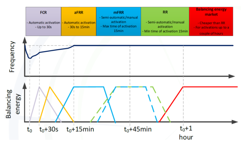 另一個(gè)是頻率控制服務(wù)FCR,PCR一次調(diào)頻可以看作是輔助服務(wù)階梯的第一級(jí)。FCR中的資產(chǎn)在接收到電網(wǎng)信號(hào)后 30 秒內(nèi)對(duì)電網(wǎng)上的短期頻率不平衡作出反應(yīng),(二級(jí)調(diào)頻目標(biāo)是覆蓋15 分鐘)。