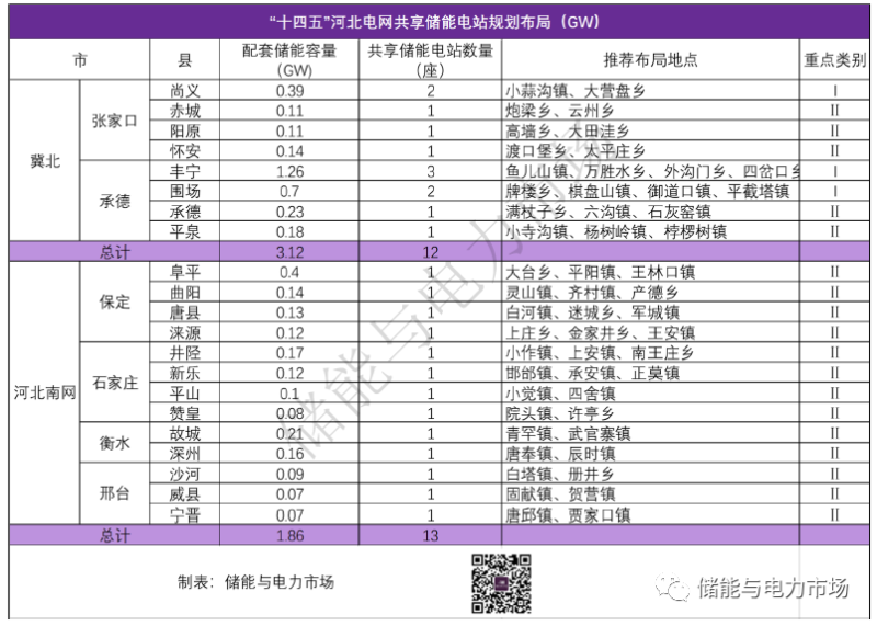在全面調研河北實際情況后,《方案》將河北省各縣區(qū)分成了一類、二類兩類區(qū)域,一類區(qū)域可配置2-3個儲能電站,二類區(qū)域可配置1個儲能電站。