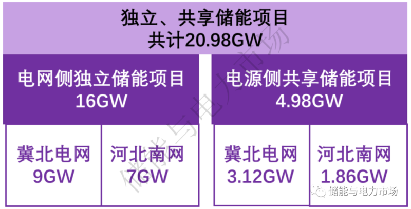 依據(jù)這兩個方案,河北省“十四五”期間將布局儲能電站共計20.98GW。其中電網側獨立儲能電站16GW,電源側共享儲能項目4.98GW。