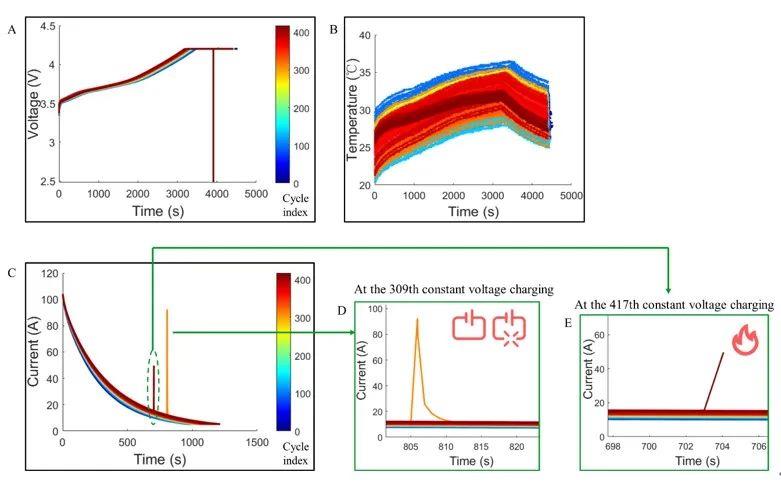此外還發(fā)現(xiàn)有一個(gè)缺陷電池(電池C)在循環(huán)到第309圈時(shí)發(fā)生了內(nèi)短路熔斷現(xiàn)象,作者為了研究內(nèi)短路熔斷電池的安全性,讓其繼續(xù)循環(huán),該電池在第417圈時(shí)發(fā)生了突發(fā)自燃,這說明發(fā)生過內(nèi)短路熔斷的電池依然具有再次內(nèi)短路的風(fēng)險(xiǎn),作者也提出了電池內(nèi)短路熔斷故障篩查和預(yù)警的方法,并建議對(duì)于已經(jīng)發(fā)生過內(nèi)短路熔斷的電池需要進(jìn)行報(bào)廢處理。