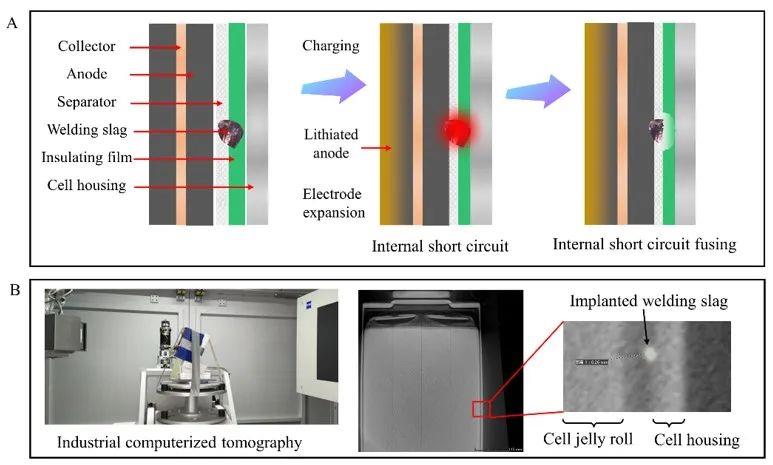 不同于以往用針刺、擠壓、過充、外短、泡水、外部加熱等濫用行為觸發(fā)的電池?zé)崾Э?,也不同于通過在電池內(nèi)部植入記憶合金、低熔點(diǎn)合金、石蠟等物質(zhì)(這些物質(zhì)不可能在電池實(shí)際生產(chǎn)制造過程中被混入)觸發(fā)的電池?zé)崾Э兀髡呤状螐?fù)現(xiàn)了電池在正常使用情況下自引發(fā)的突發(fā)型熱失控,更加接近于實(shí)際生活中出現(xiàn)的電池突然自燃。另外,還復(fù)現(xiàn)了電池在正常使用情況下自引發(fā)的內(nèi)短路熔斷現(xiàn)象。這項(xiàng)研究證明了電池內(nèi)部特殊位置的顆粒雜質(zhì)異物缺陷是引發(fā)電池突然自燃的罪魁禍?zhǔn)?,揭示了異物缺陷引發(fā)電池內(nèi)短路和熱失控的演化過程和影響規(guī)律,提出了突然自燃的預(yù)警方法和防控方法。