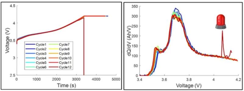 將在試制線上人為制作的缺陷電池進(jìn)行了常規(guī)老化循環(huán)充放電測試實(shí)驗(yàn),測試過程中無任何熱濫用、機(jī)械濫用、電濫用等操作,其中一個(gè)異物缺陷電池(電池A)在前11圈的循環(huán)中數(shù)據(jù)無異常,但在第12圈的恒流充電階段發(fā)生了突然自燃。如圖2所示,根據(jù)數(shù)據(jù)分析發(fā)現(xiàn),根據(jù)基于傳統(tǒng)一致性(單體間電壓差異、溫度差異、SOC差異等)的診斷算法無法實(shí)現(xiàn)早期預(yù)警,作者提出了一種面向電池全生命周期的安全預(yù)警方法,不受單體間不一致性的影響,根據(jù)該次實(shí)驗(yàn)結(jié)果表明可實(shí)現(xiàn)提前4分鐘的預(yù)警。