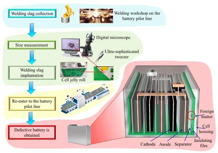 清華大學(xué)歐陽明高院士團(tuán)隊(duì)與蜂巢能源科技股份有限公司多部門合作,從電池全生命周期管理角度出發(fā),對(duì)涉及電池安全的各個(gè)生產(chǎn)工序和使用環(huán)節(jié)進(jìn)行全面剖析和研究,重點(diǎn)就可能造成電池突然自燃的顆粒雜質(zhì)異物缺陷問題(焊渣、粉塵、顆粒雜質(zhì)等,粒徑一般在幾十到幾百微米級(jí)別)展開了研究。為了研究成果能夠指導(dǎo)產(chǎn)業(yè)實(shí)際,該項(xiàng)研究并不是在傳統(tǒng)實(shí)驗(yàn)室中進(jìn)行,而是選擇了在電池試制線上,并且是大容量動(dòng)力電池,而不是實(shí)驗(yàn)室中常用的微型電池。如圖1所示,在電池試制線上的一個(gè)裝配工序,人為故意在一些電池半成品中分別植入不同粒徑的異物后,重新投入試制線,并監(jiān)控這些人為制作的異物缺陷電池在試制線后續(xù)的所有數(shù)據(jù)和狀態(tài)變化。通過對(duì)出現(xiàn)異常情況的電池拆解,揭示了不同粒徑大小異物對(duì)電池的影響情況和規(guī)律。