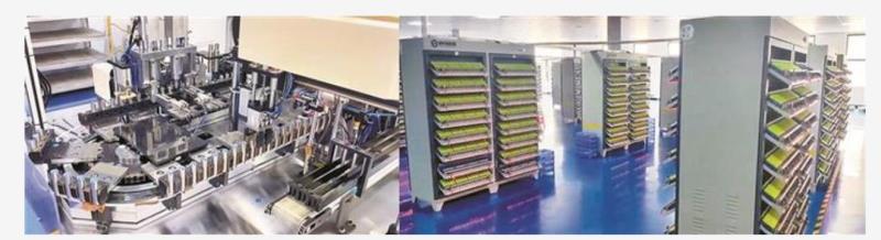 新型電池規(guī)模化產(chǎn)線局部(左)及批量測(cè)試(右)。