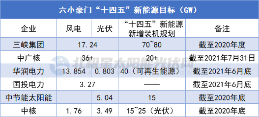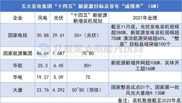 在“五大發(fā)電集團”中,除大唐外,其余四大集團均相繼公布了“十四五”期間的新能源規(guī)劃,裝機目標(biāo)普遍介于70~80GW,年新增目標(biāo)14~16GW。