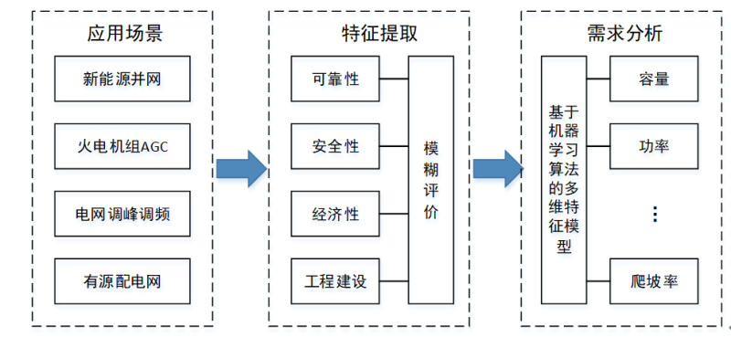 最后,根據(jù)提出的應(yīng)用場景特征參數(shù),構(gòu)建的典型應(yīng)用場景模型,采用機(jī)器學(xué)習(xí)方法建立典型應(yīng)用場景的仿真模型,分析應(yīng)用場景特征與電力系統(tǒng)運行參數(shù)之間的對應(yīng)關(guān)系,揭示場景特征量與儲能參數(shù)和特性需求的函數(shù)關(guān)系。