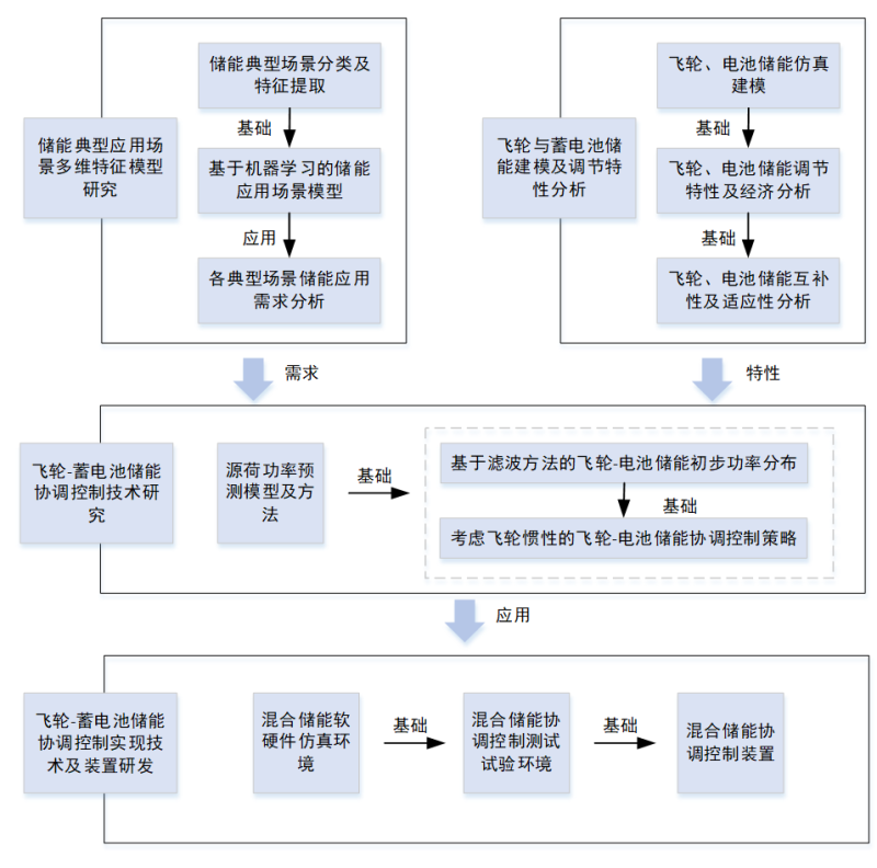 飛輪-電化學(xué)復(fù)合儲能關(guān)鍵技術(shù)及示范應(yīng)用分為四個研究內(nèi)容開展工作,技術(shù)路線如下圖所示。首先構(gòu)建儲能典型應(yīng)用場景的多維度特征模型,揭示場景特征量與儲能參數(shù)和特性需求的函數(shù)關(guān)系,精準(zhǔn)描述應(yīng)用場景對儲能參數(shù)和特性的需求;其次,建立飛輪和電化學(xué)電池儲能的仿真模型,分析飛輪與電池儲能的技術(shù)和經(jīng)濟(jì)特性;接著,研究飛輪與電化學(xué)電池儲能的協(xié)調(diào)控制策略,提升混合儲能系統(tǒng)的調(diào)節(jié)性能、運行安全性和經(jīng)濟(jì)性;最后,在上述模型與方法基礎(chǔ)上,研究飛輪-電化學(xué)混合儲能協(xié)調(diào)控制架構(gòu)、集成方案等實現(xiàn)技術(shù)。