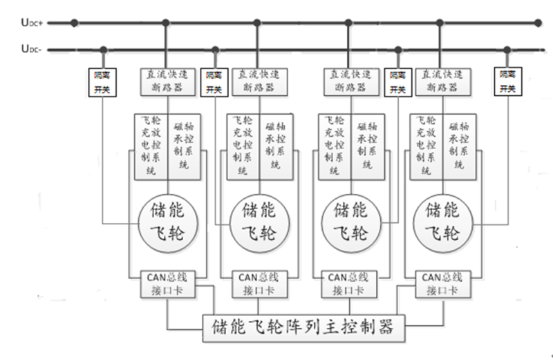 并聯(lián)儲能飛輪陣列均衡控制策略,包括儲能飛輪、飛輪充放電控制系統(tǒng)、磁軸承控制系統(tǒng)、快速直流斷路器、儲能飛輪陣列主控制器、CAN總線接口和公共直流母線。
