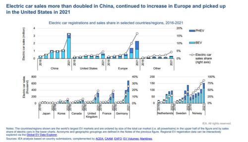 2021年全球主要車市電動(dòng)車銷量表現(xiàn)