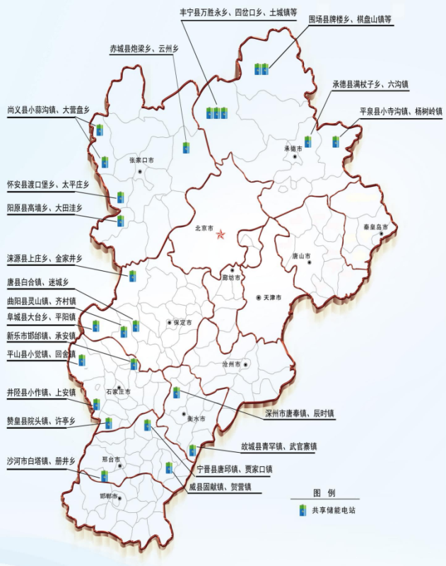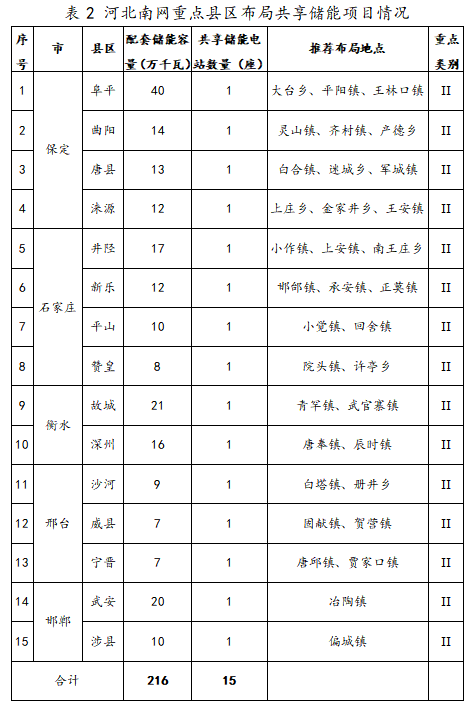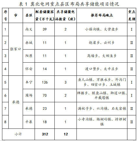 (二)II類(lèi)縣區(qū)布局。經(jīng)測(cè)算,II類(lèi)縣區(qū)20個(gè),包括赤城、陽(yáng)原、懷安、承德、平泉、阜平、曲陽(yáng)、唐縣、淶源、井陘、新樂(lè)、平山、贊皇、故城、深州、沙河、威縣、寧晉、武安、涉縣,每個(gè)縣區(qū)可布局1個(gè)共享儲(chǔ)能電站,每座儲(chǔ)能電站建設(shè)規(guī)模不低于10萬(wàn)千瓦、不高于30萬(wàn)千瓦(見(jiàn)表圖)。其余按配套儲(chǔ)能單獨(dú)建設(shè)。