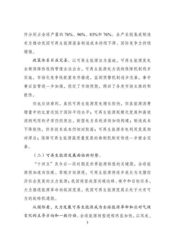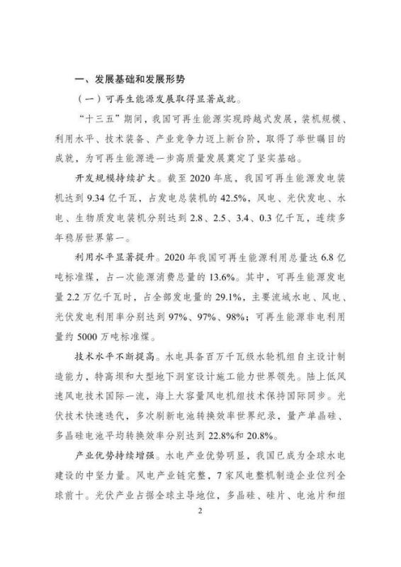 為深入貫徹“四個(gè)革命、一個(gè)合作”能源安全新戰(zhàn)略,落實(shí)碳達(dá)峰、碳中和目標(biāo),推動(dòng)可再生能源產(chǎn)業(yè)高質(zhì)量發(fā)展,根據(jù)《中華人民共和國國民經(jīng)濟(jì)和社會(huì)發(fā)展第十四個(gè)五年規(guī)劃和2035年遠(yuǎn)景目標(biāo)綱要》和《“十四五”現(xiàn)代能源體系規(guī)劃》有關(guān)要求,我們組織編制了《“十四五”可再生能源發(fā)展規(guī)劃》。現(xiàn)印發(fā)給你們,請(qǐng)遵照?qǐng)?zhí)行。