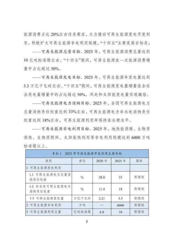 ——可再生能源發(fā)電目標(biāo)。2025年,可再生能源年發(fā)電量達(dá)到3.3萬億千瓦時(shí)左右。“十四五”期間,可再生能源發(fā)電量增量在全社 會(huì)用電量增量中的占比超過50%,風(fēng)電和太陽能發(fā)電量實(shí)現(xiàn)翻倍。