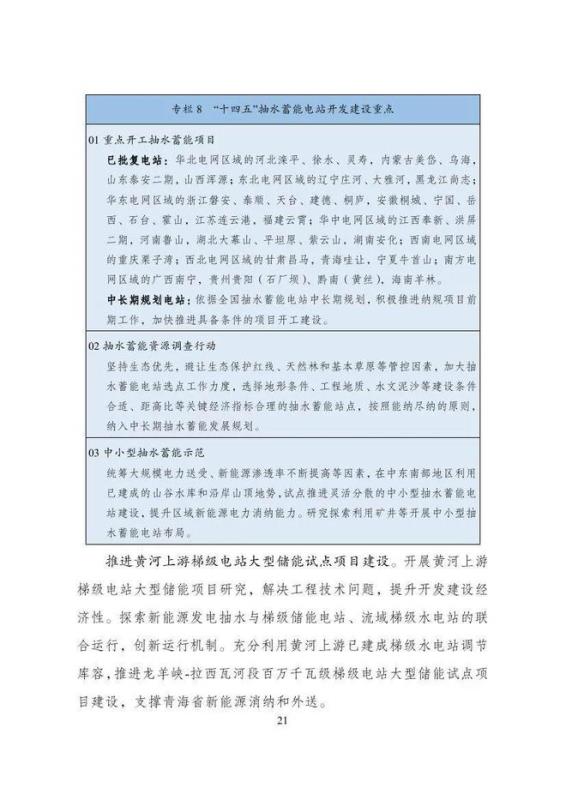 1、開展黃河上游梯級(jí)電站大型儲(chǔ)能項(xiàng)目研究,解決工程技術(shù)問題,提升開發(fā)建設(shè)經(jīng)濟(jì)性。探索新能源發(fā)電抽水與梯級(jí)儲(chǔ)能電站、流域梯級(jí)水電站的聯(lián)合運(yùn)行,創(chuàng)新運(yùn)機(jī)制。充分利用黃河上游已建成梯級(jí)水電站調(diào)節(jié)庫容,推進(jìn)龍羊峽-拉西瓦河段百萬千瓦級(jí)梯級(jí)電站大型儲(chǔ)能試點(diǎn)項(xiàng)目建設(shè),支撐青海省新能源消納和外送。