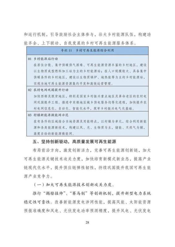 規(guī)劃提出,加快建設(shè)可再生能源存儲(chǔ)調(diào)節(jié)設(shè)施,強(qiáng)化多元化智能化電網(wǎng)基礎(chǔ)設(shè)施支撐,提升新型電力系統(tǒng)對(duì)高比例可再生能源的適應(yīng)能力。加強(qiáng)可再生能源發(fā)電終端直接利用,擴(kuò)大可再生能源多元化非電利用規(guī)模,推動(dòng)可再生能源規(guī)?;茪淅?,促進(jìn)鄉(xiāng)村可再生能源綜合利用,多措并舉提升可再生能源利用水平。