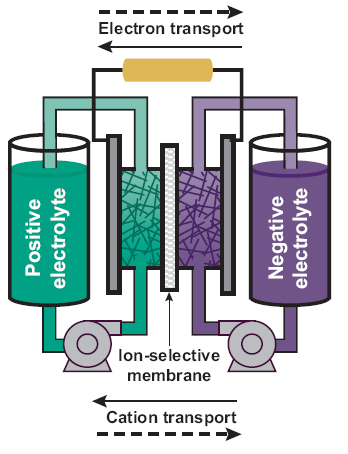 分離反應(yīng)器內(nèi)正負(fù)電解質(zhì)的交換膜具有對液流電池的技術(shù)和成本產(chǎn)生重大影響。雖然具體要求取決于化學(xué)性質(zhì),但要平衡的典型特性集是電導(dǎo)率、選擇性、穩(wěn)定性和材料成本。對于液流電池而言,在使用壽命內(nèi)保持性能至關(guān)重要。目前大多數(shù)釩氧化還原液流電池(VRFB)采用離子選擇性膜,根據(jù)分子的電荷分離分子。