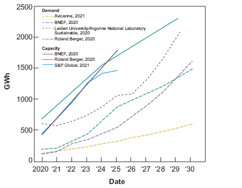 圖2.6 預(yù)計從2020年到2030年全球鋰離子電池制造能力和需求的增長