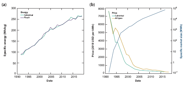 圖 2.5 隨著鋰離子電池市場規(guī)模的擴(kuò)大 (b),比能量 (a) 的歷史增長和價格的下降