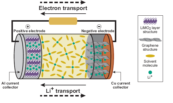 鋰離子電池屬于可充電電池系列,它利用負(fù)極和正極的固體化合物作為可逆鋰離子存儲的主體。在放電過程中,鋰離子從負(fù)極在電池內(nèi)部遷移,通過液體電解質(zhì)嵌入到正極,而電子同時通過外部電路沿相同方向移動,為連接電池的設(shè)備供電。在充電過程中,這個過程是相反的,在外部電源提供的電壓下,鋰離子從正極遷移到負(fù)極,電子流過外部電路。鋰離子電池成為一種相對成熟的電池技術(shù),得益于三十多年的商業(yè)發(fā)展。這多虧了幾個因素——包括鋰的原子質(zhì)量較低;能夠在高質(zhì)量和體積濃度下可逆地儲存鋰離子,并且電極電位(電池電壓)差異很大的正極和負(fù)極;以及高電導(dǎo)率電解質(zhì)、支持組件、電池設(shè)計和制造方法的開發(fā)——如今的鋰離子電池提供的能量和功率密度優(yōu)于大多數(shù)其他種類的電池。最先進(jìn)的鋰離子電池的標(biāo)稱電壓為3.6V~4.0V,其比能量(或稱重量能量密度)在100Wh/kg到250Wh/kg之間,并且能量密度在300Wh/L到650Wh/L之間。它們具有較高的往返能量效率(85%~95%)、較低的維護(hù)要求、足夠的循環(huán)壽命(多達(dá)數(shù)千次完全充放電)以及較低的自放電速率。這些優(yōu)點使鋰離子電池成為廣泛應(yīng)用的主流技術(shù),其應(yīng)用范圍廣泛,其中從便攜式電子產(chǎn)品和電動工具到電動汽車(EV)和固定式儲能系統(tǒng)。