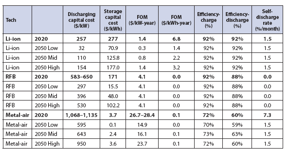 作為此項研究的一部分,麻省理工學(xué)院的研究團(tuán)隊估計了鋰離子電池、液流電池和金屬空氣電池在當(dāng)前(2020年)和未來(2050年)的性能和成本指標(biāo),對未來成本的估計包括低值、中值和高值。然后將這些成本估算用于以后的電網(wǎng)建模分析。許多研究已經(jīng)探討分析了鋰離子電池的歷史、當(dāng)前和預(yù)計未來成本。而該研究團(tuán)隊引用了美國國家可再生能源實驗室(NREL) 2020年年度技術(shù)基線(ATB)調(diào)查報告中的數(shù)據(jù),這是一個被廣泛引用的來源,與許多其他已發(fā)表的報告非常一致。對于當(dāng)前(2020年)的成本,這份報告在研究中使用自下而上的成本模型,其中包含電池儲能系統(tǒng)組件的詳細(xì)成本信息,包括鋰離子電池組、逆變器和平衡安裝所需的系統(tǒng)。對于未來(2050年)的鋰離子電池成本,該報告根據(jù)對2018年或2019年發(fā)布的19個來源的文獻(xiàn)回顧做出預(yù)測。麻省理工學(xué)院的研究團(tuán)隊分別使用該文獻(xiàn)綜述中的下限、中值和上限預(yù)測作為建模分析中的低、中、高成本假設(shè)。一些不太成熟的儲能技術(shù)(即液流電池和金屬空氣電池)的技術(shù)經(jīng)濟(jì)評估受到組件和系統(tǒng)成本信息來源有限以及工程設(shè)計和工程設(shè)計缺乏既定領(lǐng)域標(biāo)準(zhǔn)的挑戰(zhàn)。為了縮小這些差距,研究團(tuán)隊調(diào)查了已經(jīng)發(fā)表的文獻(xiàn)并聘請了行業(yè)專家。其估計值與撰寫本文時(2022年2月)其他已發(fā)布報告中的估計值基本一致,并且依賴于基于同行評審工作的輸入、假設(shè)和計算。盡管如此,這些值應(yīng)被視為早期估計值,隨著商業(yè)化的擴(kuò)大和特定化學(xué)品的發(fā)展,未來可能會對其進(jìn)行改進(jìn)。