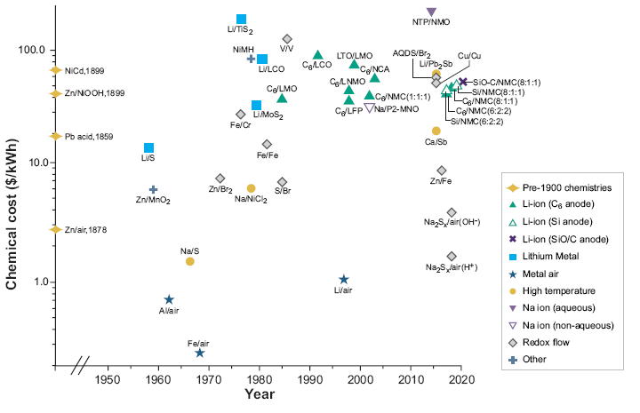 圖2.2 電池電化學(xué)儲能的化學(xué)成本