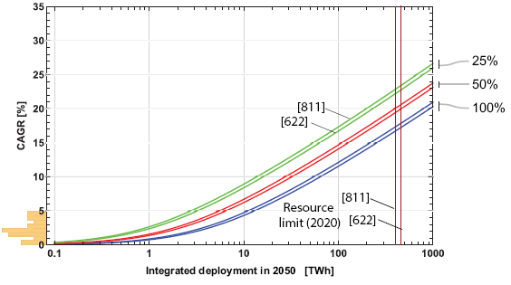 評(píng)估材料供應(yīng)限制的另一種更靈活和動(dòng)態(tài)的方法是計(jì)算滿足需求所需的生產(chǎn)復(fù)合年增長(zhǎng)率(CAGR) 。對(duì)于不同的電池,假設(shè)2050年的能量容量目標(biāo)是給定的。圖2.10~圖2.13顯示了鋰、鈷、鎳和釩的復(fù)合年增長(zhǎng)率(CAGR)到2050年達(dá)到綜合部署的指定目標(biāo)。假設(shè)生產(chǎn)開(kāi)始于2020年并以恒定的復(fù)合年增長(zhǎng)率增長(zhǎng)。這些圖表簡(jiǎn)單地顯示了可變電池成分(對(duì)于鋰離子電池)的影響以及與其他應(yīng)用的競(jìng)爭(zhēng)。例如,在圖2.10中,不同顏色的條帶用于顯示所需的復(fù)合年增長(zhǎng)率如何隨著關(guān)于用于電池生產(chǎn)的新產(chǎn)品比例的不同假設(shè)而變化(假設(shè)為常數(shù),例如25%、50%和100%)。鋰離子組件元素的彩色條帶的寬度顯示所需的產(chǎn)量增長(zhǎng)如何取決于NMC成分的不同選擇,假設(shè)鎳、錳和鈷的比例范圍為6:2:2至8:1:1。圖表上的垂直條給出了估計(jì)的全球總資源(基于2020年的估計(jì))施加的能量容量限制,假設(shè)100%的元素專(zhuān)用于電池生產(chǎn)。最后,圖表左軸的直方圖給出了1970年至2020年之間的數(shù)量,在此期間,相關(guān)元素的平均復(fù)合年增長(zhǎng)率(CAGR)對(duì)應(yīng)于值在縱軸上。對(duì)這些數(shù)字的仔細(xì)研究揭示了有多么顯著(也許不切實(shí)際)鋰、鈷、鎳和釩的產(chǎn)量必須增長(zhǎng),以支持電化學(xué)儲(chǔ)能容量的部署,例如到2050年達(dá)到100TWh。