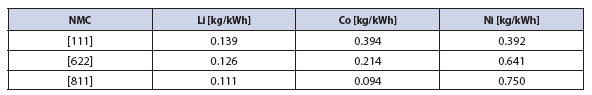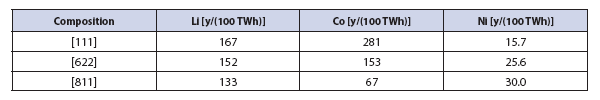在鋰離子電池的情況下,負(fù)極通常是石墨和電解質(zhì)通常是含有鋰鹽的有機(jī)液體。研究團(tuán)隊(duì)專(zhuān)注于正極,它通常由LiMO2族中的層狀氧化物組成(其中M代表過(guò)渡金屬和其他金屬)。本文重點(diǎn)介紹目前廣泛使用的鋰離子正極,NMC-622是近年來(lái)出現(xiàn)的,NMC-811出現(xiàn)在鋰離子電池的發(fā)展路線圖中。為了適應(yīng)這些比率的演變,表2.4提供了所有這三種NMC電池配方的三種受限元素(鋰、鈷和鎳)的材料強(qiáng)度估計(jì)值。
