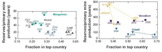 然而,隨著時(shí)間的推移而減少或增加,表明市場(chǎng)存在波動(dòng)的可能性。圖2.9繪制了幾個(gè)關(guān)鍵要素隨時(shí)間(以五年為增量)相對(duì)于最大生產(chǎn)國(guó)供應(yīng)比例的靜態(tài)消耗指數(shù)。它表明,與鋼(即錳、鎳)、鋅和鉛相關(guān)的元素的消耗指數(shù)在過(guò)去20年中一直相對(duì)穩(wěn)定(圖2.9a),而靜態(tài)消耗指數(shù)和鋰的供應(yīng)集中度、鈷和釩的揮發(fā)性更強(qiáng)(圖2.9b)。特別是,鈷的生產(chǎn)地點(diǎn)在地理上變得更加集中,鈷的靜態(tài)消耗指數(shù)隨著時(shí)間的推移而下降。