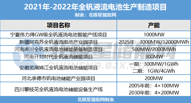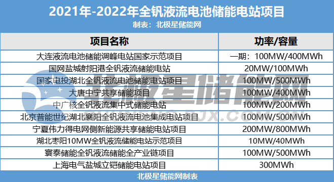 根據(jù)電極活性物質(zhì)的不同,液流電池可分為全釩液流電池、鐵-鉻液流電池、鋅溴液流電池等,其中全釩液流電池發(fā)展最快,商業(yè)化程度最高。其中,全釩液流電池的價(jià)格隨著產(chǎn)業(yè)的發(fā)展在不斷變化。在2019年以前,因下游需求小、生產(chǎn)規(guī)模不大、產(chǎn)業(yè)配套不成熟等問題,全釩液流電池單瓦時(shí)價(jià)格高達(dá)4元以上。雖然全釩液流電池曾因造價(jià)較高發(fā)展受阻,但是隨著我國(guó)對(duì)儲(chǔ)能市場(chǎng)的開發(fā)以及釩價(jià)格的下降,2021年開始全釩液流電池示范項(xiàng)目集中出現(xiàn)。據(jù)不完全統(tǒng)計(jì),2021年3月至2022年5月,國(guó)內(nèi)共有10個(gè)正在規(guī)劃或建設(shè)的全釩液流電池儲(chǔ)能項(xiàng)目,總規(guī)模約3.74GWh,詳情如下: