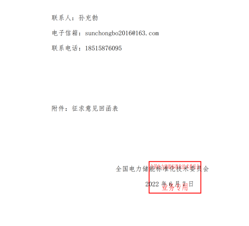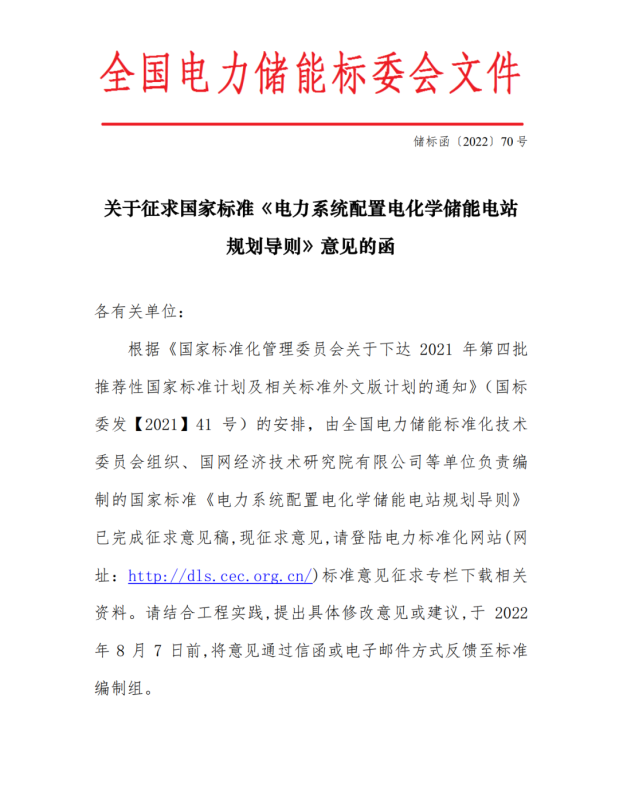 關(guān)于征求國家標(biāo)準(zhǔn)《電力系統(tǒng)配置電化學(xué)儲(chǔ)能電站規(guī)劃導(dǎo)則》意見的函