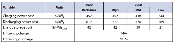 盡管如此,可以開(kāi)發(fā)出高、中、低成本的估算值,并與報(bào)告的數(shù)字進(jìn)行比較。例如,天然氣發(fā)電廠和熱儲(chǔ)能系統(tǒng)的成本信息可用于分別估算CAES系統(tǒng)電力和能源容量的參考成本。由于CAES系統(tǒng)的地上部件(如壓縮機(jī)、膨脹機(jī)和熱交換器)技術(shù)成熟,它們的成本可以給定的工廠進(jìn)行估計(jì)??梢允褂脕?lái)自聚光太陽(yáng)能應(yīng)用的數(shù)據(jù)以一定的準(zhǔn)確度估算低溫和中溫蓄熱的成本。高溫儲(chǔ)存(600℃以上)的成本更不確定。大部分剩余的不確定性CAES成本來(lái)自空氣儲(chǔ)能成本的不確定性。