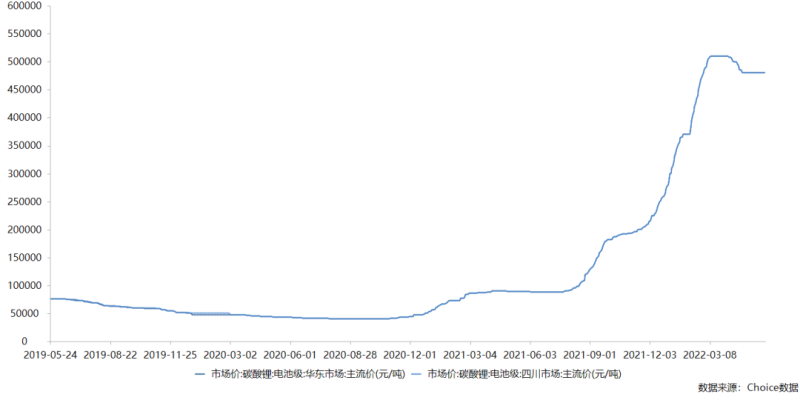 根據(jù)動力電池產(chǎn)業(yè)數(shù)據(jù)顯示,國內(nèi)2021年動力電池裝車量達(dá)154.5GWh,同比累計增長142.8%,2022年預(yù)期的動力電池裝車量將達(dá)到249GWh。高增長反映了下游電動汽車整車的需求旺盛。而在下游旺盛的需求刺激之下,動力電池原材料磷酸鐵鋰材料以及三元鋰材料供需逐漸緊張,鋰礦價格也是水漲船高。