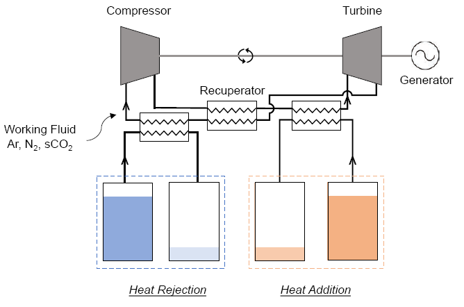 盡管文獻中對“中溫”的定義不明確,但在這里使用它來指代大約550℃~1,000℃。這些溫度下的熱量可以驅(qū)動替代動力循環(huán),例如封閉式布雷頓循環(huán),以實現(xiàn)40%~55%范圍內(nèi)的往返效率。這些循環(huán)可以與顯熱存儲材料(如巖石)或相變材料(如鋁合金)配對。