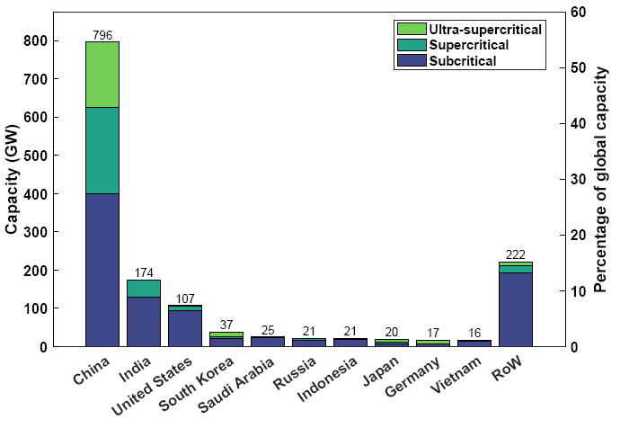 在國際上有更多的機會,因為燃煤發(fā)電廠的建造時間較晚,而且還在繼續(xù)建造,尤其是在新興市場和發(fā)展中經(jīng)濟體國家。隨著各國重新評估燃煤發(fā)電的經(jīng)濟和環(huán)境影響,安裝新的蒸汽輪機容量(主要是燃煤發(fā)電廠)的計劃通常正在縮減。圖4.11顯示了當前運行電廠安裝基數(shù)最大的10個國家到2050年將少于50年的汽輪機容量。該數(shù)字不包括新工廠的建設。在目前在新增產(chǎn)能方面領先世界的中國和印度,大多數(shù)新建和最近建造的燃煤發(fā)電廠或者是超臨界的,或者是超超臨界的,因此具有40%以上的效率。