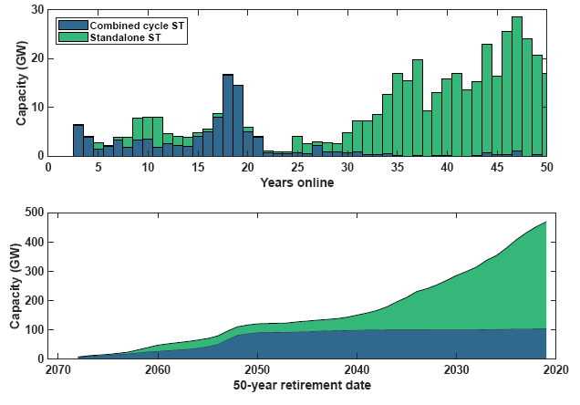 一個重要的考慮因素是被重新利用的發(fā)電廠的剩余壽命。美國的汽輪機發(fā)電廠的平均工作壽命是50年。盡管工廠之間存在基于設備、操作歷史和維修情況的差異,但這是一個有用的近似值。使用蒸汽輪機進行儲能可以通過降低利用率和更多循環(huán)來延長或縮短標稱50年的使用壽命。圖4.9上部的圖表顯示了美國小于50年的汽輪機裝機容量的工作壽命。底部的圖表顯示了根據(jù)50年的工作壽命預計該容量何時退役。該圖使用來自美國環(huán)境保護署2018數(shù)據(jù)庫的數(shù)據(jù),并未考慮新增產(chǎn)能。