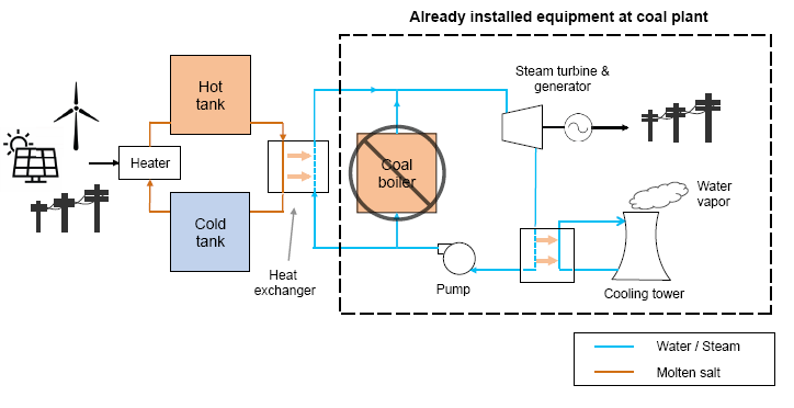 ?通過用儲熱裝置和新的蒸汽發(fā)生器替代現(xiàn)有蒸汽輪機發(fā)電廠使用的化石燃料和鍋爐,現(xiàn)在可以實施重新利用現(xiàn)有蒸汽輪機發(fā)電廠的戰(zhàn)略。