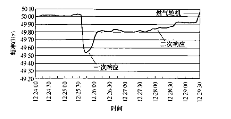 圖5-3 系統(tǒng)在某次大規(guī)模發(fā)電停運(yùn)事故后的頻率與備用響應(yīng)情況