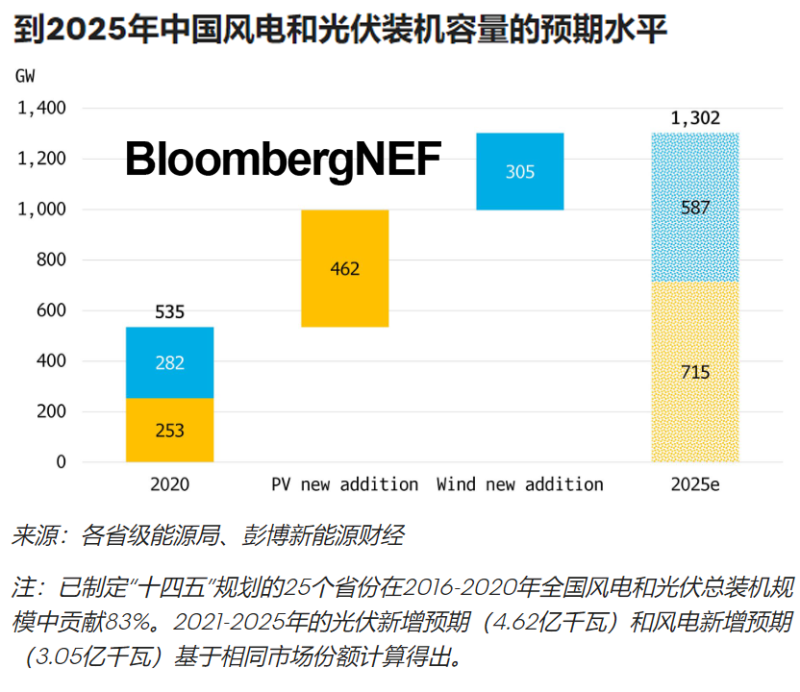 預(yù)期中國(guó)到2025年的風(fēng)電和光伏總裝機(jī)容量