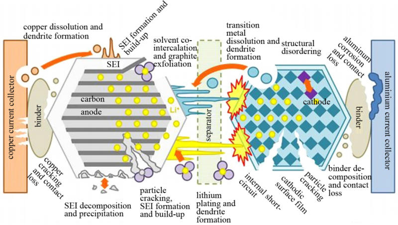 圖3揭示了鋰離子電池老化過(guò)程所有可能經(jīng)歷的內(nèi)部變化。電池的首次充電過(guò)程使負(fù)極(一般為嵌鋰碳)和電解質(zhì)發(fā)生電化學(xué)反應(yīng),生成SEI膜;在電池的后續(xù)循環(huán)過(guò)程中,電化學(xué)寄生副反應(yīng)使SEI沉積并變厚,電極材料的不斷膨脹與收縮導(dǎo)致新的活性位點(diǎn)暴露出來(lái),在快速充放電或電極活性物質(zhì)分布不均勻的情況下,活性物質(zhì)(模型中一般簡(jiǎn)化為顆粒)容易發(fā)生粉化、碎裂、脫落或結(jié)構(gòu)錯(cuò)位;與此同時(shí),如果電池長(zhǎng)期在高于其額定電流的電流密度下快速充電或低溫下充電,其負(fù)極表面容易形成金屬鋰枝晶。金屬鋰用作電池負(fù)極時(shí),也容易產(chǎn)生枝晶,若這兩種枝狀晶體逐漸生長(zhǎng),容易刺穿隔膜,引起電池內(nèi)部的短路。此外,當(dāng)電池過(guò)放電時(shí)(1~2 V),負(fù)極的集流體銅箔開(kāi)始溶解,在電極上析出形成銅枝晶,易造成電池短路,同樣,正極集流體鋁的表面氧化膜長(zhǎng)時(shí)間與電解質(zhì)相互作用可能發(fā)生溶解,使得鋁箔被電解質(zhì)腐蝕。