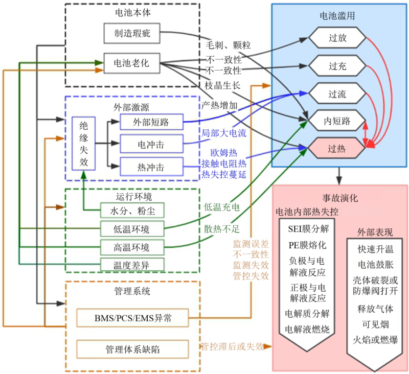 儲(chǔ)能安全問(wèn)題是系統(tǒng)性問(wèn)題,事故的發(fā)生往往由多因素交互作用演化發(fā)展,最終導(dǎo)致電池濫用及熱失控的發(fā)生。借鑒韓國(guó)儲(chǔ)能事故報(bào)告對(duì)安全誘因的分類(lèi),本文將安全事故成因劃分為電池本體、外部激源、運(yùn)行環(huán)境及管理系統(tǒng)四類(lèi),并討論四類(lèi)誘發(fā)因素的相互作用機(jī)制及對(duì)電池濫用和失控過(guò)程的觸發(fā)機(jī)制。圖2歸納了四類(lèi)誘發(fā)因素交互及濫用觸發(fā)關(guān)系。