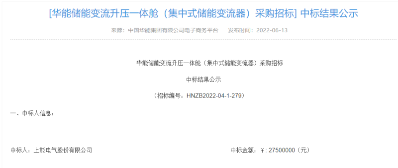 中國儲(chǔ)能網(wǎng)訊:據(jù)了解,6月13日,中國華能集團(tuán)有限公司電子商務(wù)平臺(tái)發(fā)布華能儲(chǔ)能變流升壓一體艙(集中式儲(chǔ)能變流器)采購中標(biāo)結(jié)果公示。公告中顯示,中標(biāo)人為上能電氣股份有限公司,中標(biāo)金額為2750萬元。