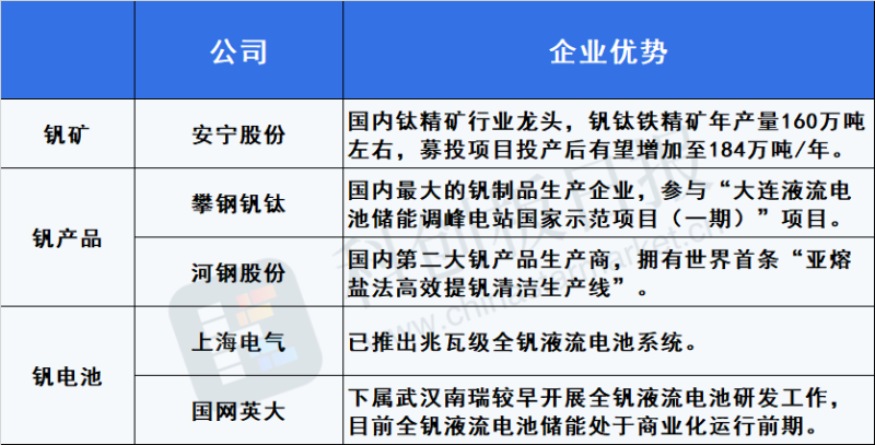 據(jù)《科創(chuàng)板日?qǐng)?bào)》整理,釩儲(chǔ)能產(chǎn)業(yè)鏈中,攀鋼釩鈦在2021年與大連博融及相關(guān)子公司、參股公司簽署合作協(xié)議,將公司多釩酸銨原料加工成釩儲(chǔ)能介質(zhì),并全部用于恒流公司(大連博融參股公司)的“大連液流電池儲(chǔ)能調(diào)峰電站國(guó)家示范項(xiàng)目(一期)”項(xiàng)目中。另有這些公司受關(guān)注: