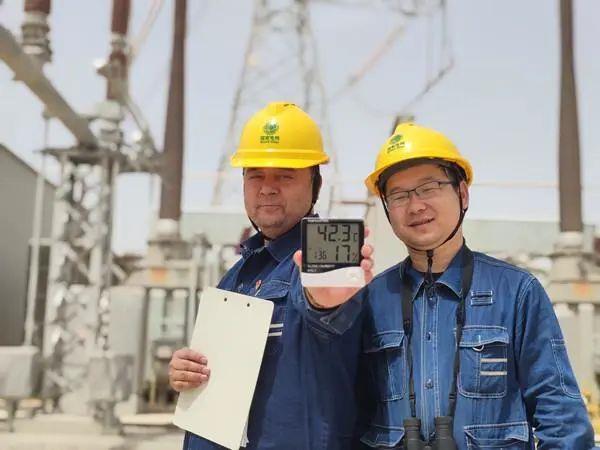 6月13日,750千伏巴楚變電站室外溫度達到42.3℃,值班員艾則孜·吐爾洪、靳永旺正在巡視設備。(白彥彬 攝)