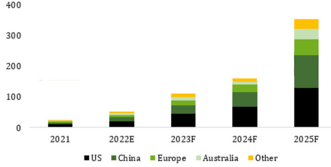 2021~2022年全球各地市場(chǎng)部署的儲(chǔ)能系統(tǒng)預(yù)測(cè)(GWh)