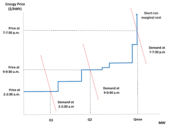 與圖8.1中描述的電力系統(tǒng)相比,該電力系統(tǒng)建立在具有穩(wěn)定邊際成本(反映不同的熱效率和燃料成本)的可調(diào)度發(fā)電設(shè)施之上,可再生能源發(fā)電的供應(yīng)該根據(jù)風(fēng)力和陽光的外生變化而上下波動。因此,不存在圖8.1中描述這樣簡單的經(jīng)濟調(diào)度曲線。此外,風(fēng)力發(fā)電和太陽能發(fā)電的短期邊際成本始終接近于零。由此類發(fā)電設(shè)施主導(dǎo)的電力市場面臨設(shè)計挑戰(zhàn):如何提供反映生產(chǎn)邊際成本的批發(fā)和零售價格信號,同時仍產(chǎn)生涵蓋投資和運營成本的預(yù)期收入。此外,如第1章和第6章所述,許多儲能技術(shù)的邊際運營成本也接近于零,并且在充電/放電循環(huán)中損失的能量相對較少。因此,這些技術(shù)引發(fā)了類似的市場設(shè)計問題。此外,以可再生能源和儲能技術(shù)為主的電力系統(tǒng)的運行特性,將會引發(fā)了重大的公平和風(fēng)險承受能力問題,這些問題必須在設(shè)計未來的零售定價機制時加以解決。