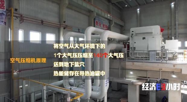 這臺(tái)空氣壓縮機(jī)的原理有點(diǎn)像我們給輪胎充氣的“打氣筒”,它的作用是將空氣從大氣環(huán)境下的1個(gè)大氣壓,壓縮至140個(gè)大氣壓,并送到地下鹽穴。產(chǎn)生的熱能儲(chǔ)存在導(dǎo)熱油罐中,持續(xù)8個(gè)小時(shí),電站就完成了一個(gè)儲(chǔ)能周期。