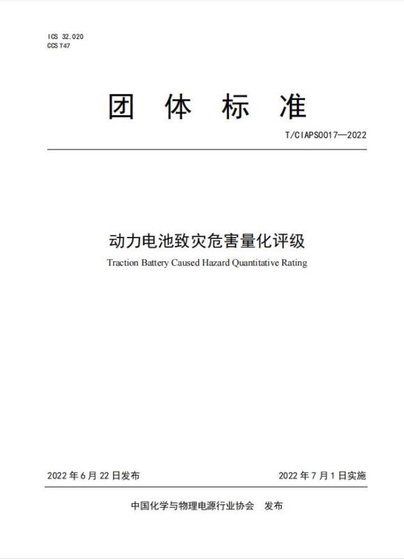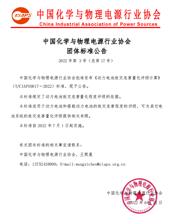 中國化學(xué)與物理電源行業(yè)協(xié)會批準(zhǔn)發(fā)布《動力電池致災(zāi)危害量化評級計算》(T/CIAPS0017―2022)標(biāo)準(zhǔn),現(xiàn)予公告。