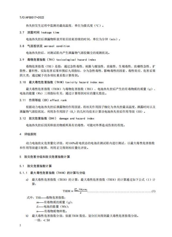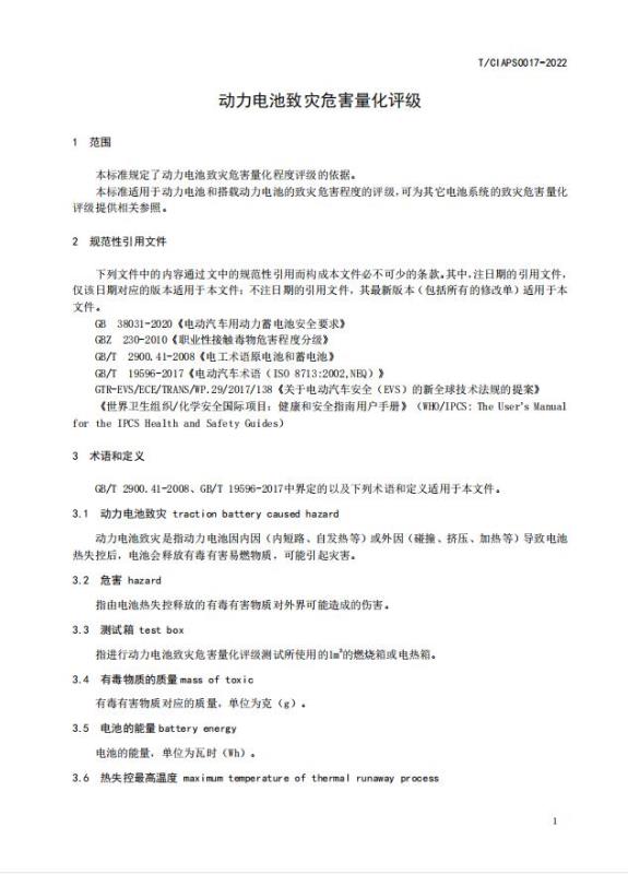 本標(biāo)準(zhǔn)適用于動力電池和搭載動力電池的致災(zāi)危害程度的評級,可為其它電池系統(tǒng)的致災(zāi)危害量化評級提供相關(guān)參照。