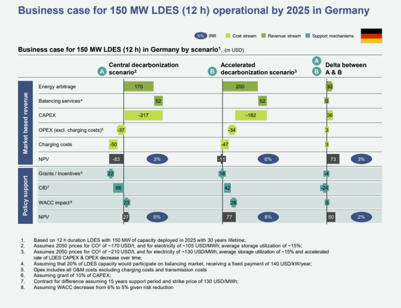 長時儲能理事會展示了這些工具在實踐中的使用方法,包括一個理論上的商業(yè)案例——在德國2025年投運的150MW、12小時解決方案,如下圖所示。