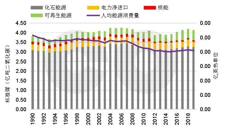能源消費(fèi)量的歷史峰值年為2006年,30多年來消費(fèi)量在峰值附近小幅波動(dòng)。2006年后,能源消費(fèi)量經(jīng)歷了先下降后又小幅上升過程,目前為峰值的95%,與1998年相當(dāng)(見圖4)。長遠(yuǎn)看,由于可再生能源利用規(guī)模不斷擴(kuò)大,而化石能源被替代仍有一段較長的過程,能源消費(fèi)仍存在繼續(xù)增長的可能。